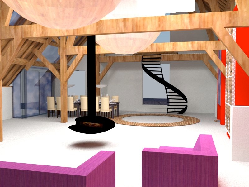 Zo ongeveer wordt het ! En dat wordt elke dag een beetje meer zichtbaar zoals je kunt zien op de onderste foto. Vorige week maandag is de stucadoor langsgeweest en weer vertrokken. Gelukkig kwam hij die woensdag al terug en is gebleven. De kasten aan de rechterkant worden nu gestuukt. Op de tekening rechts zijn drie kamers, achter de trap is de doorgang naar de hal zichtbaar en links achter de eethoek komt de keuken. Boven zijn wanden geplaatst voor de slaapkamers en de badkamer en wordt de vloer gesloten.