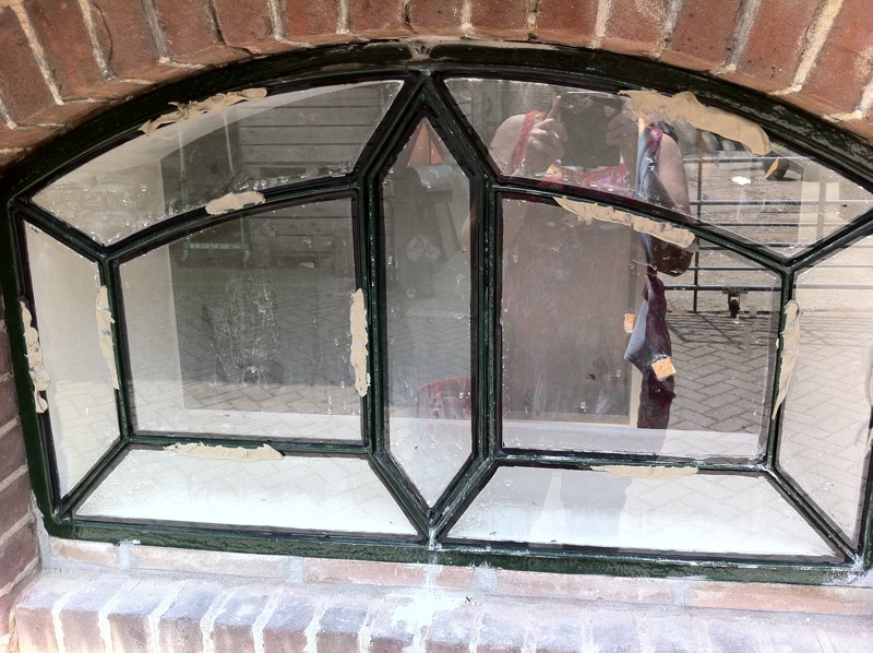 De glaszetter is langs geweest en heeft de stalramen eenzaam achtergelaten met een klodder ouderwetse stopverf. Ze zijn wel mooi gestraald en behandeld. Het stucwerk binnen geeft dit raam een mooi nisje. Alleen valt misschien op dat het raam wat laag zit. Maar dat zit niet laag, het pad, de tuin en terras zijn in de loop van de jaren teveel opgehoogd, waardoor de vloer van het huis lager zit dan de straat/tuin etc. Op een dag zoals vandaag giert de regen dan ook naar binnen. Toevallig is langs deze gevel al een drainage buis ingegraven. Aan de voorkant en andere zijkant van het huis moeten we dat nog doen.