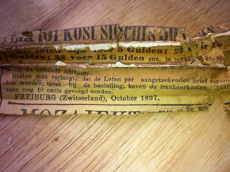 Vandaag een stukje krant gevonden tussen de planken in de keuken. Toevallig stond er ook een datum bij: 1897. In die tijd is dus de laatste grote verfklus gedaan aan de balken! In dat jaar wordt ook voor het eerste de chemische kleurstof indigo op de markt gebracht. In ons huis zijn de planken echter donkerbruin geverfd. Het stukje krant bewaren we en stoppen het terug tijdens het schilderen.