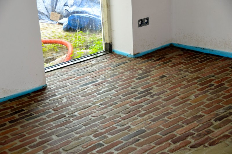 Nu de vloer in de deel gelegd wordt, kun je echt goed zien hoe het straks wordt. Het stukje straat aan deze kant is dagen werk geweest en dan moet de andere kant ook nog. Dit zijn oude bakstenen, maar wel het goede formaat en de juiste kleur. De originele stenen die in de deel lagen zijn voor de poeren en muren gebruikt.