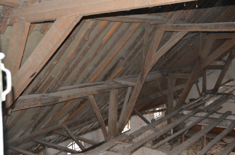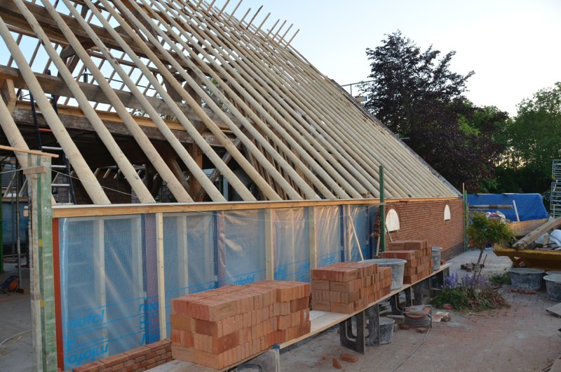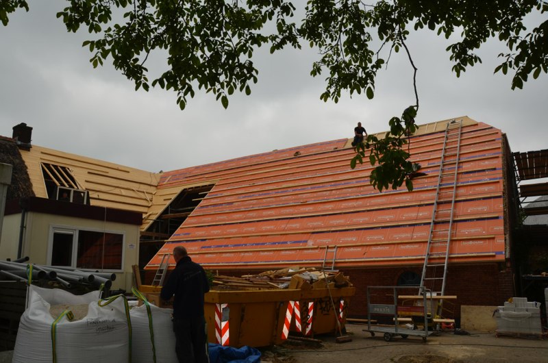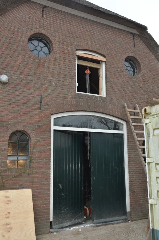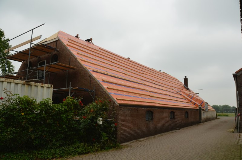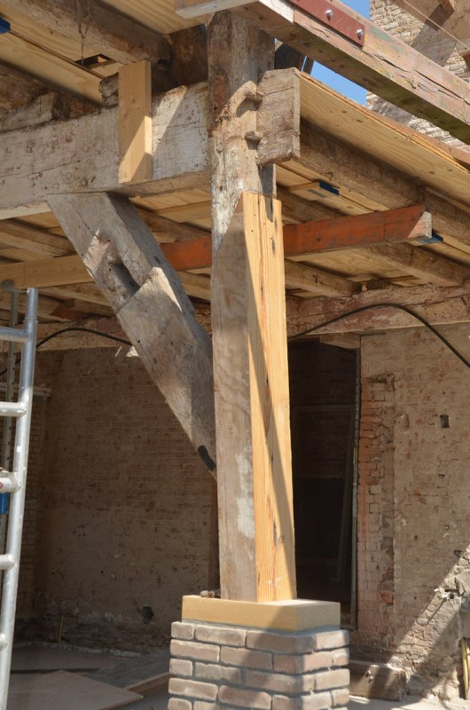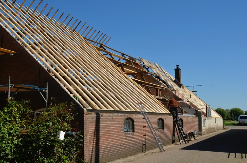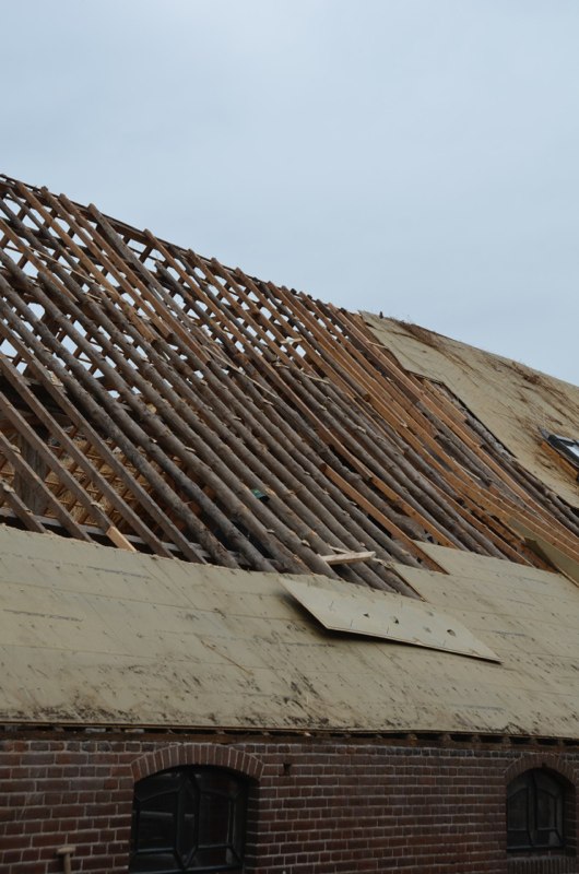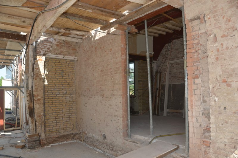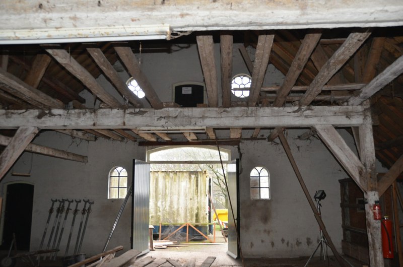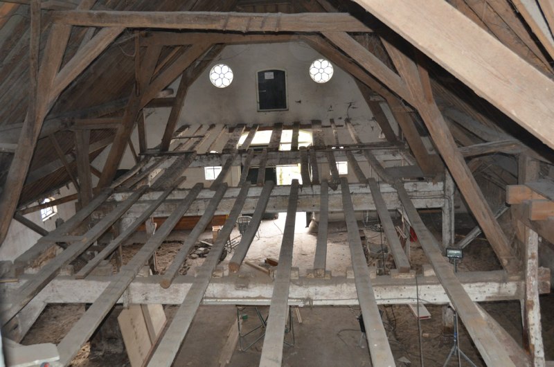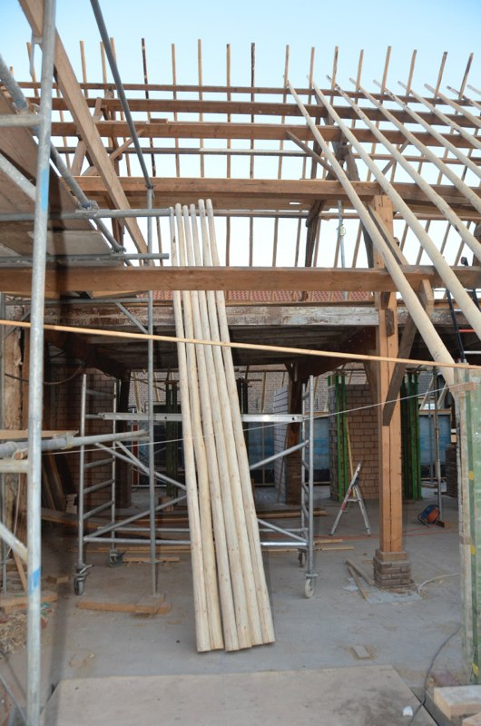 Op deze foto’s is te zien hoe de deel er uit zag bij het begin van de verbouwing. Na het slopen van een aantal 20ste eeuwse toevoegingen is de transformatie tot woonkamer begonnen. Het stokoude gebint is daarbij zoveel mogelijk intact gelaten. De daksporen en vloerbalken van de hooizolder waren vergaan. De sporen zijn vernieuwd. Door het verwijderen van de vloerbalken is er nu een vrij uitzicht op het dak met de sporen.