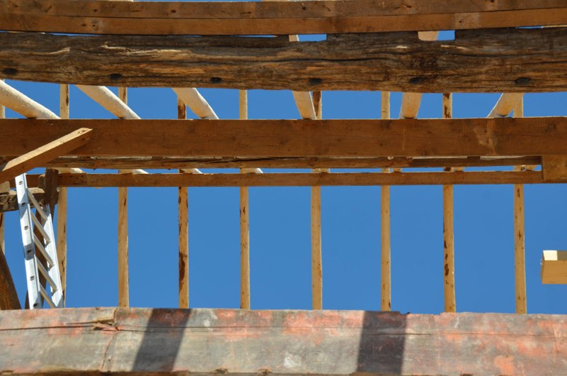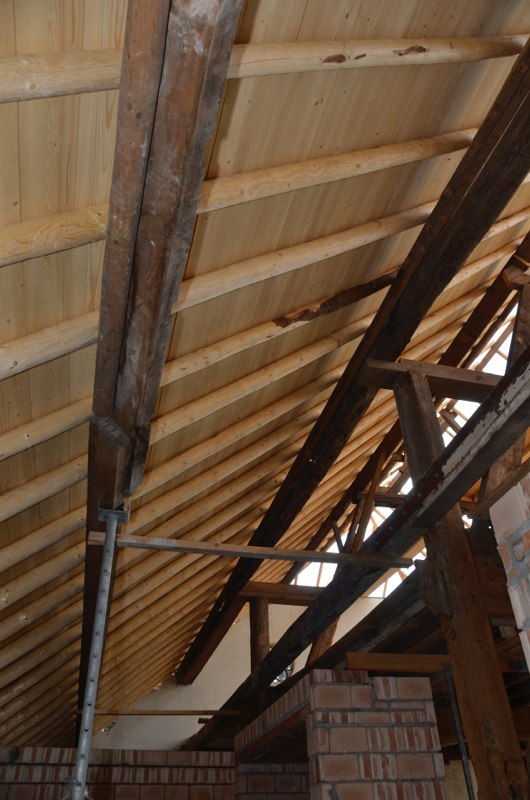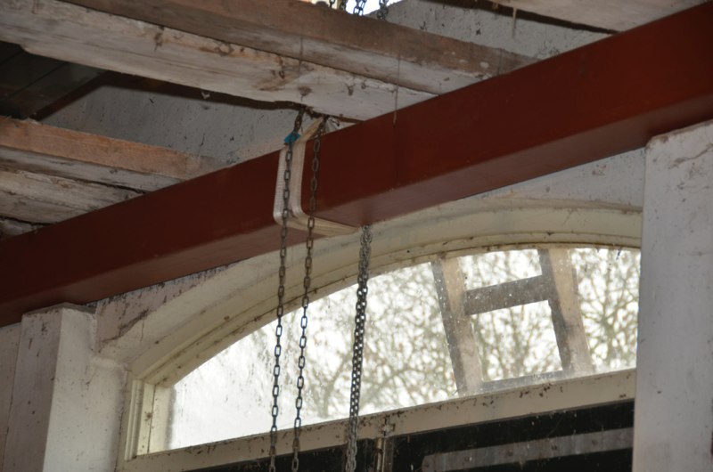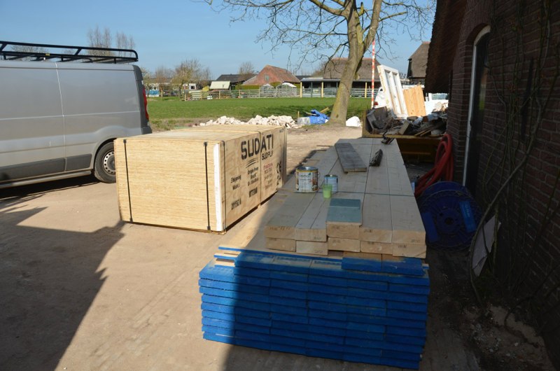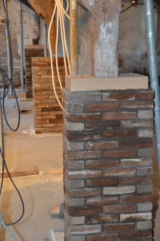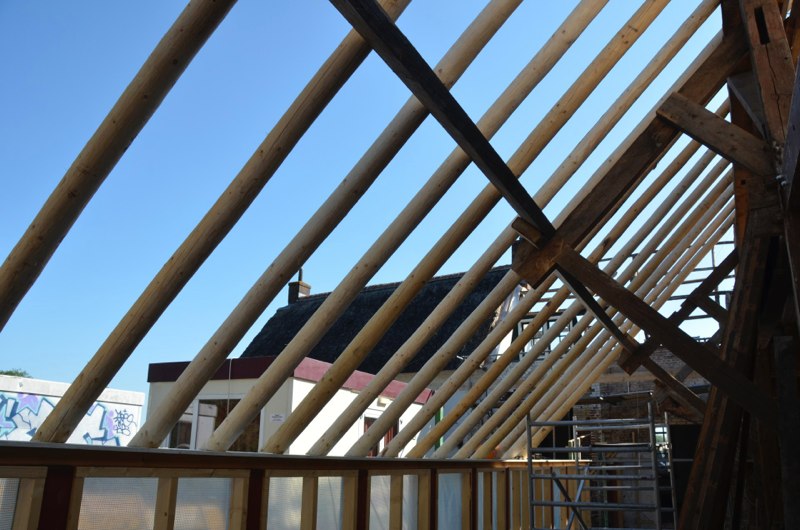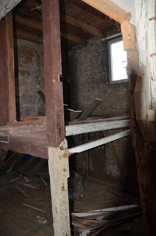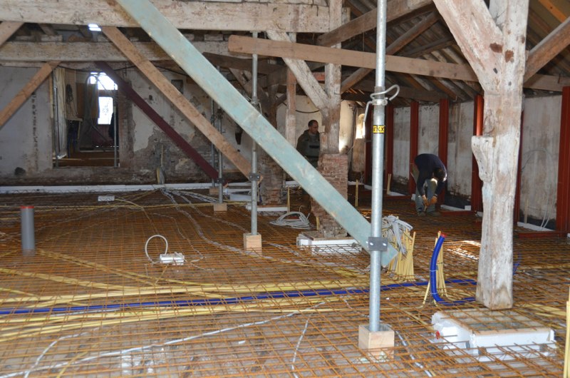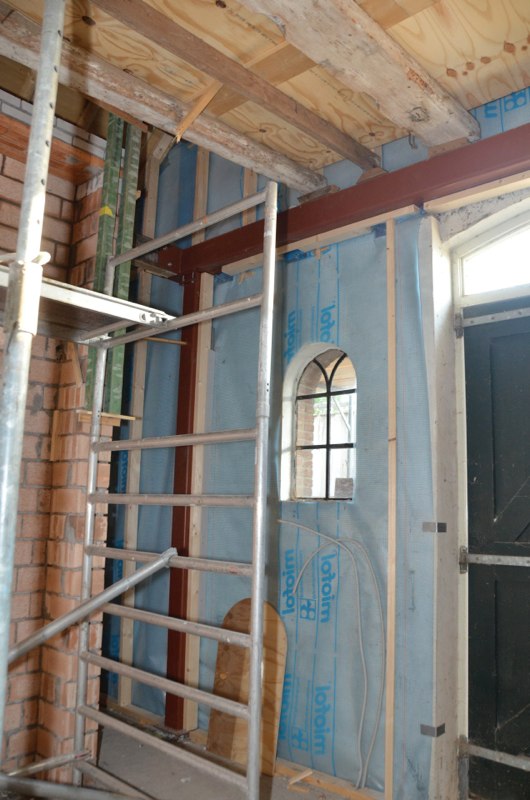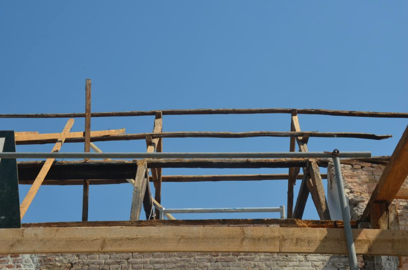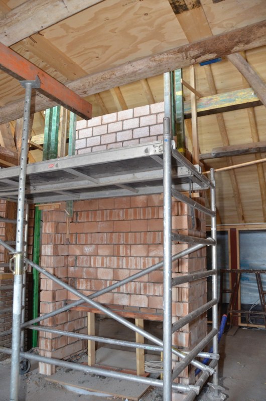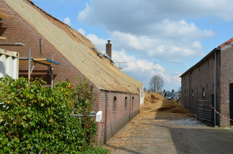 Op deze foto’s is te zien hoe de deel er uit zag bij het begin van de verbouwing. Na het slopen van een aantal 20ste eeuwse toevoegingen is de transformatie tot woonkamer begonnen. Het stokoude gebint is daarbij zoveel mogelijk intact gelaten. De daksporen en vloerbalken van de hooizolder waren vergaan. De sporen zijn vernieuwd. Door het verwijderen van de vloerbalken is er nu een vrij uitzicht op het dak met de sporen.