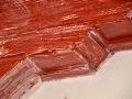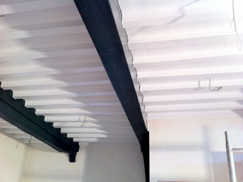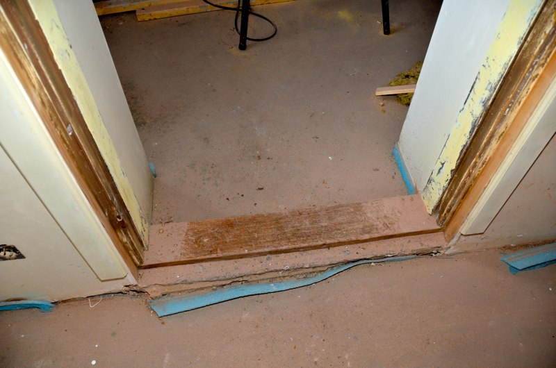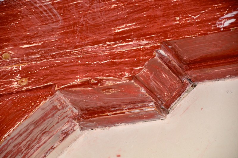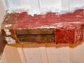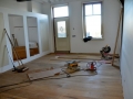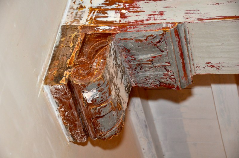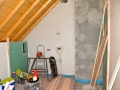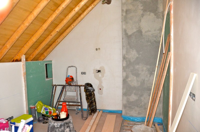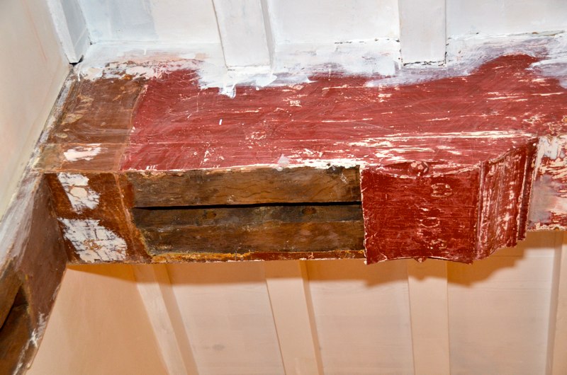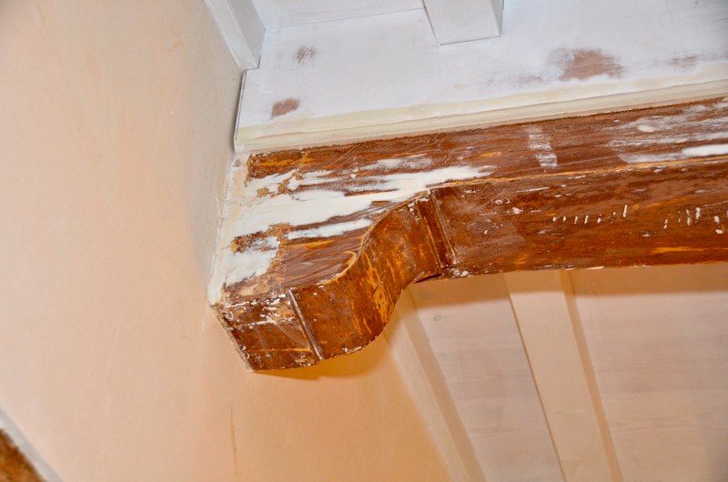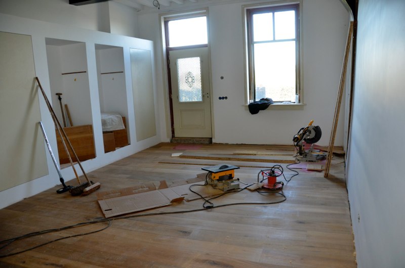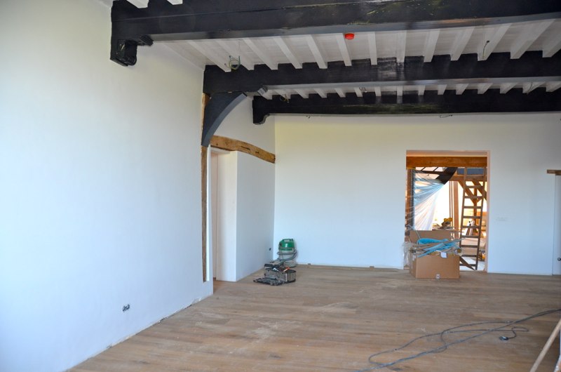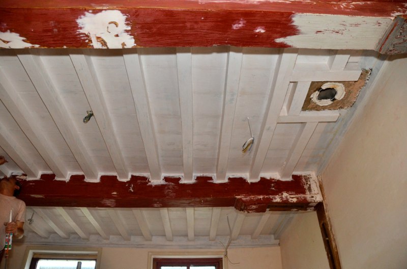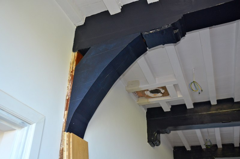 Het voorhuis is in de vorige eeuw al eens verbouwd tot woonhuis. Daarbij zijn de oude balkenplafonds deels dichtgetimmerd met zachtboard om de elektraleidingen achter te verbergen. Tot onze verrassing kwam daar in de toekomstige keuken een geheel intact kinderbalkenplafond te voorschijn.